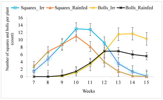 The average number of squares and bolls per plant distribution by week for upland cotton lines grown under irrigated and rainfed conditions. Data for agronomic traits were collected for nine consecutive weeks (weeks 7 to 15). Data averaged for three years, nine genotypes, and over four replications. Standard error (SE) bars were used to show the variations between irrigated and rainfed trials. Overlapping SE bars show no significant differences between irrigated and rainfed treatments.
