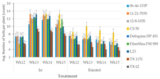Variation in average number bolls per plant across weeks for upland cotton grown under irrigated and rainfed conditions. Wk., weeks; Irr., irrigated. Average number of bolls compared by subsampling of weeks 12 (Wk12) to weeks 15 (Wk15). Standard error (SE) bars were used to show the variations among genotypes in irrigated and rainfed trials. Overlapping SE bars show no differences between genotypes in irrigated and rainfed conditions.