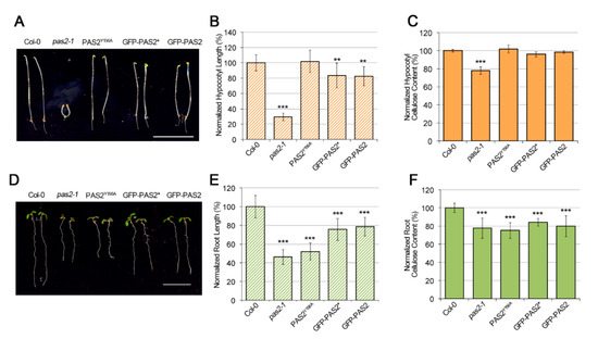 Mutations of PAS2 led to strong developmental defects, consistent with its developmental regulation of transcripts in various tissues including seedling, root, leaf, stem and flower [30,33,34,39]. pas2-1 is an EMS mutant carrying an amino acid substitution of Gly to Ser [33,34]. pas2-1 mutants could survive for up to 2 weeks on soil. pas2-1 had shorter roots under a 16-h-light and 8-h-dark growth cycle (Figure 2D,E). The cell elongation defect was drastically manifested in dark-grown seedlings as pas2-1 mutant has extremely short etiolated hypocotyls (Figure 2A,B), a feature that is often associated with cellulose deficiency of the primary cell wall [26,29,40]. To investigate whether the reduced cell elongation is associated with reduced cellulose production, the crystalline cellulose content in etiolated seedlings was measured in both dark-grown seedlings and light-grown roots [41]. pas2-1 mutants had a 22.13% and 22.30% reduction in crystalline cellulose content in dark-grown seedlings and light-grown roots, respectively (Figure 2C,F).
