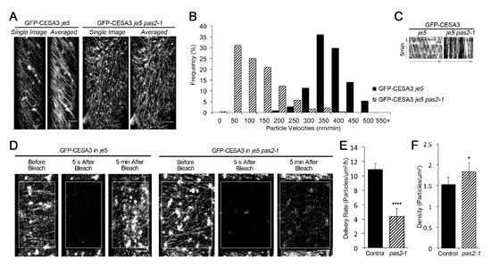 To investigate whether the cellulose reduction in pas2-1 reflects its defect in CSC dynamics or distribution, we introduced GFP-CESA3, a marker for CSC [3] in pas2-1. Consistent with the observed reduction in cellulose content, the motility of GFP-CESA3 was reduced in pas2-1. While the average velocity of CSCs is about 350 nm/min in wild type plants [10,20], the motility was much lower in pas2-1 mutants (Figure 3A–C, Supplemental Video S1). Quantification of particle velocities showed that the average velocity of CSCs of pas2-1 was reduced by 2/3 of that of wild-type plants (376.36 ± 55.35 nm/min for WT and 123.35 ± 79.89 nm/min for pas2-1, respectively). Consistently, the kymograph of each particle appeared as nearly straight parallel lines in pas2-1 mutants instead of crossed oblique lines in WT (Figure 3C), indicating a very low velocity.