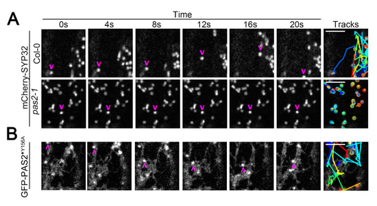 The pas2-1 mutant specifically disrupts the Golgi motility, which was rescued by pPAS2::GFP-PAS2Y156A. (A) Analysis of Golgi motility in control (Col-0) and pas2-1 seedlings. (B) Analysis of Golgi motility in pas2-1 seedlings transformed with pPAS2::GFP-PAS2Y156A. A representative image and tracking analysis were shown (n = 30 per genotype). A series of single-frame images was taken to show the locations of mCherry-SYP32 and GFP-PAS2Y156A labeled particles at multiple time points. Arrows indicate the location of one representative particle. Tracks indicate the trajectories of all particles (marked by circles) within 20 s. Different colors represent for different particles been tracked. Bar = 5 μM.