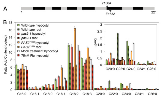 Both disruption of PAS2′s dehydratase activity and pharmacological inhibition lead to VLCFA depletion in hypocotyls and roots. (A) A schematic graph showing the position of two point mutations PAS2Y156A (left) and PAS2E163A (right), indicated by arrows. (B) Fatty acid methyl esters (FAMES) analysis of hypocotyls of 4-day-old etiolated seedlings and roots of 15-day-old light-grown seedlings. The pPAS2::GFP-PAS2Y156A plants showed differential extend of VLCFA decrease in hypocotyls and in roots; and 75nM Flu treatment mimicked the VLCFA pool in the pas2-1 mutants, characterized by reduction in VLCFA content and increased short chain fatty acid portion. Moreover, the Flu treatment caused more severe depletion of VLCFA in the hypocotyls, comparing to pPAS2::GFP-PAS2Y156A seedlings.
