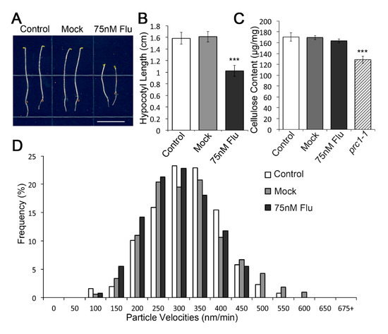 General VLCFA synthesis defect does not influence the functionality of the cellulose synthesis machinery. (A) Application of 75 nM Flu reduced the hypocotyl length of etiolated seedlings. 4-day-old dark-grown wild type (Col-0) seedlings grown on ½ MS medium (Control) or ½ MS medium containing 75 nM Flu or comparable amount of DMF (Mock). (B) Quantification of hypocotyl length of seedlings from the drug treatment analysis. *** p < 0.0001 (n ≈ 50 per experimental group). (C) Crystalline cellulose production was not affected following Flu treatment. Cellulose content of 3-day-old seedlings grown on ½ MS medium, ½ MS medium containing 75 nM Flu or comparable amount of DMF. Error bars represent SD. *** p < 0.0001. (D) A histogram showing the distribution of GFP-CESA3 particle velocities. The mean velocity of plasma membrane GFP-CESA3 for control, Mock and Flu groups were 319.59 ± 83.93 nm/min (n = 258, 14 cells from 6 seedlings), 318.21 ± 92.41 nm/min (n = 328, 16 cells from 7 seedlings) and 295.89 ± 79.00 (n = 127, 8 cells from 5 seedlings), respectively.