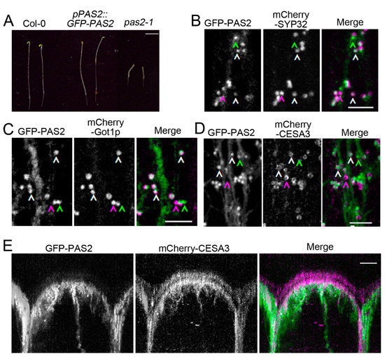 The pas2-1 mutants are EMS alleles in Col-0 background. To generate the PPAS2::GFP-PAS2 (GFP-PAS2) transgenic line, a DNA fragment containing 1.5-kb PAS2 promoter and the full-length cDNA clone of PAS2 were amplified using primers in Table S1 online and cloned into the PCR8/GW/TOPO vector (Thermo Fisher Scientific, Waltham, MA, USA). After sequencing, both fragments were cloned to the pH7WGF2 vector [55]. The verified construct was introduced into pas2-1 using Agrobacterium tumefaciens-mediated transformation [56]. A GFP-PAS2-expressing Arabidopsis thaliana transgenic line was crossed with one expressing mCherry-SYP32, -Got1p, -VTI12, -RabA1g or -RabG3f [46] to generate dual labeled transgenic lines, respectively. The point mutations were generated directed on the GFP-PAS2 construct using a QuikChange® Site-Directed Mutagenesis Kit (Agilent, Santa Clara, CA, USA). The mutated constructs were transformed into pas2-1 heterozygous background. The T1 generation was screened for pas2-1 homozygous plants. A GFP-CESA3-expressing Arabidopsis thaliana transgenic line [3] was crossed with pas2-1 heterozygous plants. F2 seedlings homozygous for pas2-1 by PCR genotyping were used for confocal imaging and other analysis.