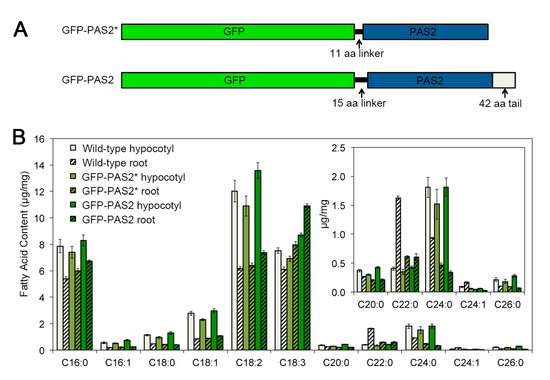 Comparison between the GFP-PAS2 transgenic line generated in this study (GFP-PAS2) and that generated by Bach et.al (GFP-PAS2*). (A). Schematic graphs showing two different GFP-fusion constructs of PAS2. (B). FAMES analysis of 4-day-old etiolated hypocotyls and the roots of 15-day-old light-grown seedlings. Both GFP-PAS2 and GFP-PAS2* seedlings have comparable VLCFA deposition to wild-type seedlings in etiolated hypocotyls, while showed decreased VLCFA (C22:0, C24:0, C24:1) content in roots. Error bars represent SD.