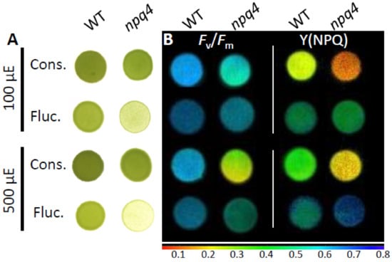 Phenotype of Light-Harvesting Complex (LHC)-like Stress-Related 1 (LHCSR3)-deficient nqq4 relative to wild type (WT-4A) under photoautotrophic conditions on agar and either diurnal constant (12/12 h, on/off) or fluctuating (10/10 min, on/off) light treatments. Representative images of (A) colonies and (B) Fv/Fm and Y (non-photochemical quenching (NPQ)) after 8 day growth (starting dilution 1:10, see Materials and Methods) under diurnal/constant (Cons.) or fluctuating (Fluc.) light of 100 (upper) or 500 (lower) µmoL photons m−2 s−1. Chlorophyll fluorescence parameters are given on a false-color scale shown below.