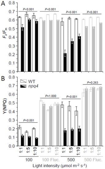 2.3. Enhanced PSII and PSI Photoinhibition Occurred in npq4 Under Constant and Fluctuating Light, Respectively