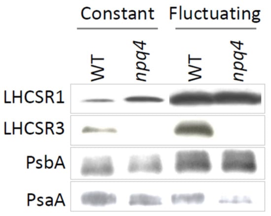 Effect of 500 µmoL photons m−2 s−1 fluctuating (10/10 min on/off) or constant (12/12 h on/off) light treatment on qE proteins and photosystem reaction center levels of photoautotrophic agar-grown cells. Levels of LHCSR1, LHCSR3, PsbA, and PsaA are shown, via Western blotting, in LHCSR3-deficient npq4 and wild type (WT-4A) grown under constant (left) or fluctuating light (right). In this Figure, exactly the same sample from each treatment was loaded for all four blots. Loading controls for saturation are shown in Figure S2.