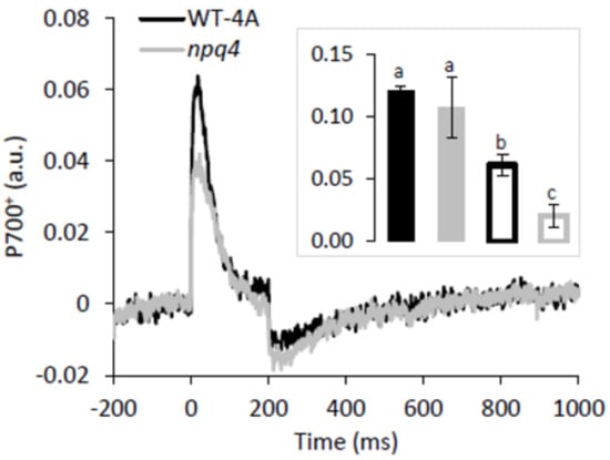 Effect of 500 µmoL photons m−2 s−1 fluctuating (10/10 min on/off) or constant (12/12 h on/off) light treatment on maximum light-induced P700+ values of photoautotrophic agar-grown cells. Wild type (WT-4A; black) and LHCSR3-deficient npq4 (gray) agar-grown cells were suspended in photoautotrophic media to a chlorophyll concentration of 30 µg mL−1, and P700+ was recorded during a 200 ms saturating pulse, starting at 0 ms, with typical traces shown after averaging the three technical replicates of fluctuating light-treated cells. The inset shows average Pm values for npq4 and WT under constant (filled) or fluctuating light (open), n = 4 replicate cultures ± SD, with different letters denoting significant difference, p < 0.05.