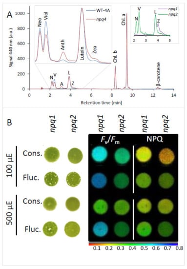 Under fluctuating light, npq4 contained significantly more (p = 0.02) antheraxanthin and slightly more zeaxanthin, and significantly less (p < 0.01) violaxanthin, showing higher activation of the xanthophyll cycle than in WT-4A (Figure 5A). While it is known that de-epoxidized xanthophylls do not play a significant contribution to qE in C. reinhardtii [], the xanthophyll cycle is still tightly coupled to high light exposure []. To investigate if differences in xanthophyll composition also influenced tolerance to fluctuating light, the NPQ mutants npq1 (no zeaxanthin) and npq2 (only zeaxanthin, and neither violaxanthin nor neoxanthin []) were included in the study. No differences in colony growth between npq1 and npq2 were observed under constant or fluctuating light (Figure 5B), but similar to the other genotypes, fluctuating light increased qE capacity and led to higher Fv/Fm values relative to cells under constant light of the same intensity (Figure 5B).