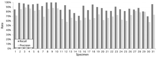 Performance of the proposed algorithm applied to 31 specimens of Hymenaea Courbaril (Jatoba Database). Overall recall and precision are 89.14% and 72.8%, respectively. Maximum recall performance is achieved at specimens #8, #9, and #10 with 100% and maximum precision performance is reached at 98% by specimen #3. Worst recall and precision performance is 70% and 58%, respectively, both at specimen #30.
