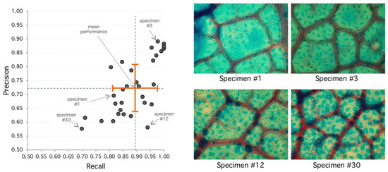 Analysis of selected specimens. (Left) Best performance is achieved at the upper-right area of the diagram with high recall and precision. Worst performance is achieved at the lower-left area. Orange cross indicates mean (recall/performance 83%/72%) and standard deviation (8%/10%). (Right) Specimen #1 represents an average performance (85%/72%) with clear regions but high diffusion. Specimen #3 has 98%/89% detection performance, and stomata shows sharp borders with clear regions leading to good detection metrics. Specimen #12 shows 94%/58% with high recall and lower precision, explained by diffuse borders and poor region definition. Specimen #30 has the poorest performance with 70%/58% with very diffuse borders and poor regions with high false positive rate.