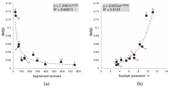 Root-Mean-Square Deviation (RMSD) versus segmented stomata number and Rayleigh parameter. (a), the RMSD decreases as a power law with number of segmented stomata. (b), RMSD increases exponentially with Rayleigh parameter. High RMSD species (red labels) tend to have lower number of segmented regions and higher Rayleigh parameter.