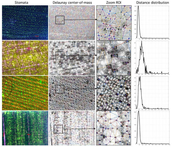 Relationship between segmented region and Rayleigh distribution histogram. First column (stomata) shows different species analyzed. Second column (Delaunay center-of-mass) shows mass centers and corresponding tessellations. Third column (Zoom Region-of-Interest, ROI) shows region of interest. Fourth column (Distance distribution) shows sensibility of histogram to spatial distribution (more at https://github.com/mlacarrasco/drtb/tree/main/stomatasDB/output).