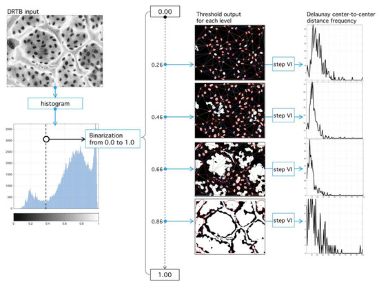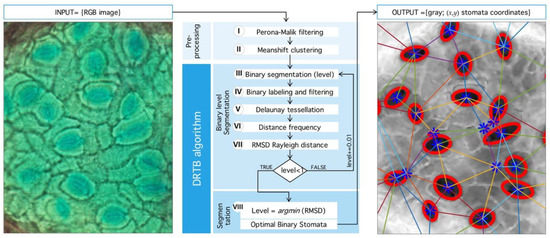 The natural way to deal with structural complexity found in stomata images is noise analysis. The latter is associated, by large, to simplification and information-reduction processes, like anisotropic diffusion, wavelet transform techniques, and nonlinear, statistical, or adaptive filters [39,40,41]. Even when image segmentation is possible, for example, by morphological processing, the use of geometric properties is desirable. Therefore, we propose a novel segmentation method that seeks an optimal binarization threshold through Rayleigh-distribution distance-minimization. This idea was inspired by Staff et al. [42], where they analyzed stomatal pore center coordinates, but, in this case, only areas of the inner triangles and their angles were reported. In Reference [43], a statistical mechanics explanation of this phenomenon is given through particle interaction, in this case, the distance between stomata, as a means of regulation and state of the tissue in general. An algorithm summary is shown in Figure 9.