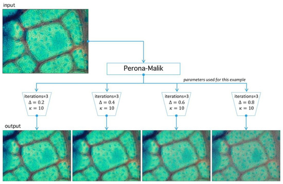 Image preprocessing with Perona-Malik (PM) filtering. PM has three main parameters: , which represents the diffusion level; , which represents an advance-step (time in the original PDE framework); and the iteration number (advance-step times iteration number is the total time in the PDE framework). Four examples are shown to exemplify diffusion action over an image; higher parameter means more diffuse image.