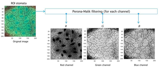 Let be an image defined over the space of arrays with rows and columns with pixels in the natural numbers. Depending on the color-space, {Red, Green, Blue} (RGB) or {Hue, Saturation, Value} (HSV)superscripts are used to refer the components. The PM filter defined from into itself is a solution of the heat-equation parameterized by representing the number of times the filter is applied (time in the original partial differential equation context) and a diffusion parameter controlling the noise level (see Reference [46] for more details) (see Figure 10). As a result of PM filter application over RGB space, the red channel increases separation levels with respect to background, and this result is relevant as the application of PM filter improves stomata profile detection, as it is exemplified in Figure 11.