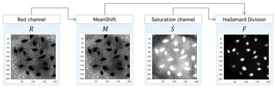 Step II. Meanshift-Hadamard: The second step is the application of Meanshift operator over the red channel to obtain an image with a reduced intensity level but with sharp defined boundaries, which eases the segmentation process. This step uses an unsupervised clustering algorithm over the intensity-space through a minimization process between each energy cluster [47]. With the aim at improving signal-background splitting, a Hadamard division [48] operator between saturation (HSV space) and red (RGB space) channels is applied. This operation enhances signal splitting, as it can be seen in Figure 12. The final operator is the consecutive application of PM, Meanshift and Hadamard division (3):