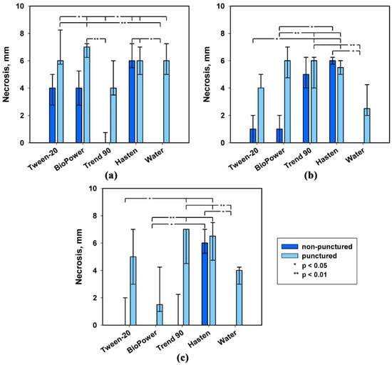Effect of leaf damage and adjuvants on phytotoxicity of S. cirsii S-47 toxins on leaf discs of S. arvensis: (a) stagonolide A, (b) stagonolide K, (c) herbarumin I. Bars represent median values and interquartile ranges. Statistically significant differences between groups were assessed by the Kruskal–Wallis test: (*) p < 0.05 and (**) p < 0.01.