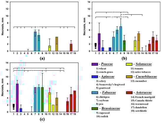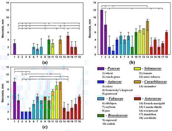 In general, the selectivity profiles of stagonolide K and herbarumin I differed from that of nonselective stagonolide A: these compounds were less phytotoxic than the last and displayed some selectivity (Figure 3, Figure 4 and Figure 5). However, Kruskal–Wallis test supported significant (p < 0.001) effect of the plant species on the size of necrotic lesion caused by S. cirsii toxins irrespective to leaf wounding or adjuvant supplementation (Table 4).