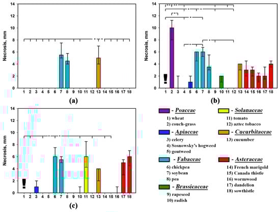 The factor of leaf wounding/adjuvant supplementation considerably affected sensitivity of the plants to stagonolide A and herbarumin I. It did not alter sensitivity of just three plant species: pea, tomato, and dandelion in the case of the first toxin, and wheat, Sosnowsky’s hogweed, and soybean in the case of the latter. Phytotoxicity of stagonolide K was much less affected by the mentioned factor altering sensitivity of 39% of assayed plant species (Table 5). Notably, the plants from the Apiaceae family and radish seem to be from insensitive to low sensitive to stagonolide K or herbarumin I irrespective to leaf wounding/adjuvant supplementation (Figure 3, Figure 4 and Figure 5).