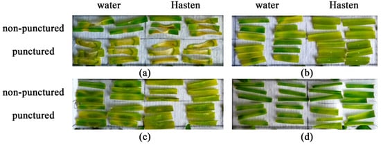 The addition of Hasten™ (0.1% v/v) just slightly altered selectivity profile of stagonolide K in the treatment of non-punctured leaf fragments showing 11 of 18 sensitive species compared to the treatment of punctured leaf fragments with water solution of the phytotoxin: intact chickpea leaves were insensitive to stagonolide K supplemented with the adjuvant while tomato leaves became sensitive to this formulation of the phytotoxin (Figure 4b,c).