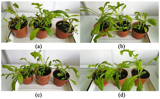 The toxins of S. cirsii formulated in 0.5% Hasten™ showed a considerable herbicidal effect on young aerial shoots of S. arvensis. In particular, the area of necrotic lesions occupied up to 80% of the leaf surface one week after the treatment of the weed with stagonolide A. The treatment with herbarumin I led to the damage of 50% of the leaf surface. The spraying of the plants with stagonolide K led to the development of single necrotic lesions. Visually, the plants were not damaged when sprayed with 0.5% Hasten™ and water (Figure 7 and Figure 8).