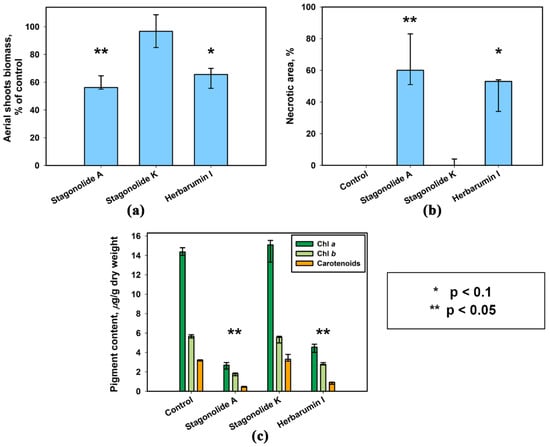 The treatment with stagonolide A and herbarumin I caused a decrease in the fresh biomass weight of the weed plants compared to the control (p < 0.05 and p < 0.1, respectively) (Figure 8). The effect of the toxins on aerial shoots of S. arvensis was manifested as extensive chlorotic and necrotic leaf lesions. The pigment content in toxin-affected leaf tissues was drastically lower than in control leaves (p < 0.05). The significant reduction in chlorophylls a and b content was observed in the samples of leaves affected by stagonolide A (81% and 69%, respectively) and herbarumin I (69% and 51% respectively) compared to control treatment. The total carotenoids content in leaves of S. arvense followed the same pattern and was found to be maximally reduced (85%) in stagonolide A-treated leaf samples (Figure 8).