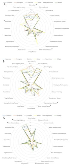 Spider plot of the sensory profile of raw (A), roasted (B) and blanched (C) almond kernles. Asterisks (*) indicate represent significant differences among cultivars p < 0.05, ANOVA Tukey’s test.