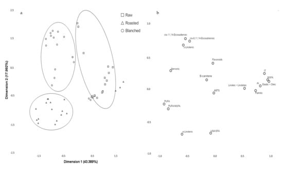 Data are presented as mean (f.w) of three replicates. Differences among means were determined by analysis of variance (ANOVA) using SPSS (Statistical Package for Social Sciences) 19.0 (IBM Corporation, New York, NY, USA). The fulfillment of ANOVA requirements, namely the normal distribution of the residuals and the homogeneity of variance was evaluated using the Shapiro–Wilk’s test (n < 50) and the Levene’s test, respectively. The Tukey test was used for the comparison of means which were considered different at a 5% significance level. A stepwise linear discriminant analysis (LDA) was performed to find the linear combination of parameters that best characterized raw, roasted, or blanched samples. The LDA involved the use of a combination of forward selection and backward elimination procedures for variable separation. Before selecting a new variable to be included in the model, it was ascertained that all previously selected variables were still significant which enabled identification of all possible significant variables. The Wilk’s lambda test was applied for variable selection through verification of the significance of each canonical discriminant functions using the probabilities F = 3.84 to add and F = 2.71 to remove. To avoid overoptimistic data modulation, the model performance was assessed using a leave-one-out cross validation procedure. Principal component analysis (PCA) was performed by plotting all data in a multidimensional space using LDA significant variables as dimensions (factor scores). With this approach, the number of variables was reduced to a smaller number of newly derived variables (principal component or factors) that adequately summarized the original information, and highlighted underlying patterns in the data collected. Scree plots were used for retaining the most useful factors taking into consideration eigenvalues greater than one and internal consistencies of high Cronbach α values.