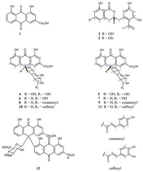 Silica gel (Merck 60 A, 230–400 mesh ASTM, Darmstadt, Germany) was used for column chromatography. Normal and reversed phase silica gel (Merck, Darmstadt, Germany) were used for thin-layer chromatography (TLC). Anthraquinones were detected using a 254/366 nm UV lamp, followed by exposure to concentrated ammonia vapors or by spraying with 10% alcoholic KOH or NaOH. Additionally, compounds were visualized spraying with 15% H2SO4/ethanol, followed by heating.