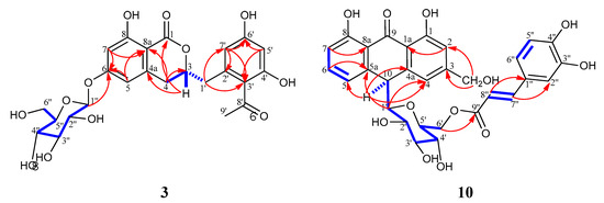 The sugar moiety for both (10) and (11) proved to be β-D-glucopyranosyl connected to the aglycone via a C–C bond (C-glycoside), similar to microdontins A and B (8 and 9). This structure is indicated by the chemical shift of the anomeric proton of the sugar with β-configuration at δH 3.30 (d, J = 9.5 Hz) in (10) and δH 3.29 (d, J = 9.4 Hz) in (11) correlated to C-1′ carbons at δC 85.8 and 85.9 ppm, respectively, in the HSQC (Heteronuclear Single-Quantum Correlation) experiment. The remaining sugar signals (H2′–H6′) were in complete agreement with the signals reported for microdontins A and B [23]. The glycosidation site in 10 and 11 was confirmed at C-10 by significant cross-peaks in the HMBC experiment from H-1′ to C-4a and C-5a, and from H-10 to C-4, C-4a, C-5, C-5a and C-1′. Additionally, the methylene protons at C-6′ were downfield shifted to δH 3.83 (dd, J = 11.7, 6.9 Hz, H-6′a) and δH 4.23 (br d, J = 11.7 Hz, H-6′b) compared to aloins A (6) and B (7), indicating esterification at C-6′. The downfield shift of C-6′ from δC 63.1 ppm in aloin B to δC 64.4 and 64.5 ppm in 10 and 11, respectively, (around 1.5 ppm) further support C-6′ acylation. This result also agrees with HMBC correlations from H-6′ to C-9″ and from the trans-olefinic protons to C-1″, C-2″, and C-6″ (Figure 2).