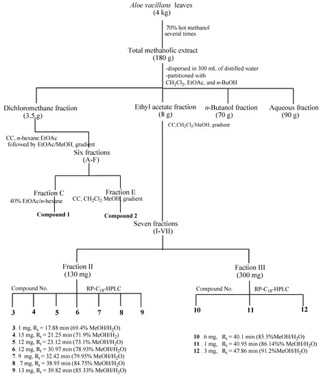 In summary, a new dihydroisocoumarin derivative, vacillanoside (3), 3,4 dihydro-6 glucopyranozyl-8-hydroxy-3-(2′-acetyl-3′,5′-dihydroxyphenyl)-methyl-1H-[2]benzopyran-1-one (6), and two new anthraquinone derivatives, vacillantins A and B (10 and 11) were isolated from the leaves of A. vacillans (Asphodelaceae) together with nine known compounds (1, 2, 4–9, and 12). The structures of these compounds were elucidated through extensive spectroscopic analyses. The total alcohol extract and different fractions were tested for their antioxidant activities in five spectrophotometric assays. The dichloromethane fraction exhibited promising free radical scavenging activity in most of the assays. Our findings add new information to the literature on the structural diversity and pharmacological activities of Aloe species. Our results suggest A. vacillans as a potential source of secondary metabolites with pharmacological and industrial importance. Moreover, these results advocate further investigation of the remaining fractions with the aim of isolating bioactive compounds exhibiting interesting biological capacities.