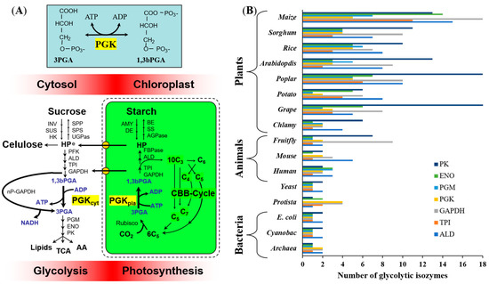 - Anderson, L.E.; Bryant, J.A.; Carol, A.A. Both chloroplastic and cytosolic phosphoglycerate kinase isozymes are present in the pea leaf nucleus. Protoplasma 2004, 223, 103–110. [Google Scholar] [CrossRef]
