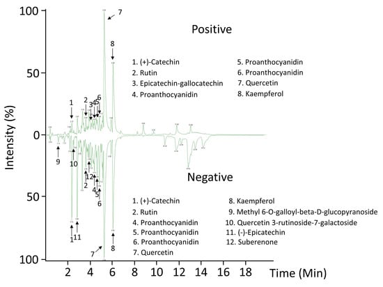 | 11 | 2.85 | 289.0718 | C15H13O6− | [M − H]− | 0 | 245.0813 | 203.0705 | 137.0234 | (−)-Epicatechin | |