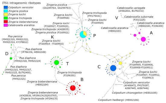 System of ITS1 ribotypes of Zingeria, Colpodium versicolor, and Catabrosella. The filled circles represent intragenomic ribotypes (A, B, C, D, K, P, T, and V), obtained via next-generation sequencing (NGS). The open circles represent sequences from GenBank.