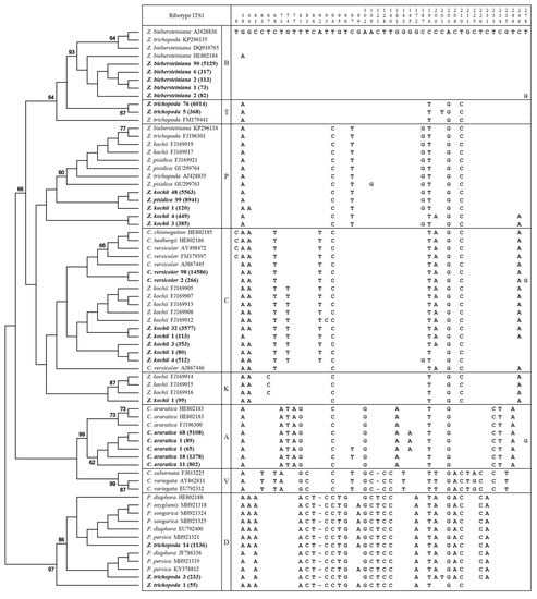 Cladogram and polymorphic nucleotides of ITS1 ribotypes of Zingeria, Colpodium versicolor, and Catabrosella. The percentage of replicate trees in which the associated taxa clustered together in the bootstrap (BS) test are shown next to the branches. The intragenomic ribotypes obtained via NGS are in bold, followed by percentage of the ribotype in the genome and total number of corresponding reads in the brackets.