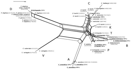 Network among ITS1 ribotypes of grasses from the Zingeria, Colpodium, and Catabrosella genera, revealed by the split decomposition algorithm. Intragenomic ITS ribotypes obtained via NGS are underlined and followed by percentage of the ribotype in genome. Sequences from GenBank followed by accession number. Groups of ribotypes are labeled by capital letters A, B, C, D, K, P, T, and V.