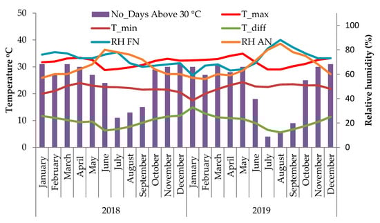 Fluctuations in monthly average maximum temperature (Tmax), minimum temperature (Tmin), difference between Tmax and Tmin (T_diff), days with Tmax greater than 30 °C and relative humidity % in the forenoon (RHFN) and afternoon (RHAN) during the experimental period for the years 2018 and 2019.