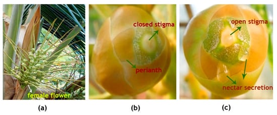 Coconut is a monoecious crop; however, in WCT, the popular tall variety selected for this study, there is hardly any overlapping of the male and female phases within an inflorescence and hence, preponderance of cross pollination is observed []. WCT plants produce on an average one inflorescence per month and each inflorescence possesses 20 ± 5 female flowers. After 3 ± 1 days of cessation of the male phase (lasts for 19 ± 5 days post anthesis), female flowers of WCT become receptive, noticed by the protrusion of pistil through the perianth segments, resulting in a wide-open stigma moist with nectar. Under natural conditions, pollination in coconut is carried out by pollinators like honeybees as well as wind [,]. In this experiment, controlled pollination was effected by dusting WCT pollen on receptive stigmas to ensure the known source of pollen and to document the exact time and date of pollination.