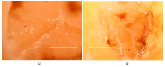 In planta pollen grain germination of the coconut variety WCT on the receptive stigma surface after pollination. (a) Ungerminated pollen grains 4 h after pollination and (b) germinated pollen grains with pollen tubes 24 h after pollination. Pollen tubes are marked by an arrow (pt); pg, pollen grains. Stigma surface was stained with quadruple stain [] and visualized using a stereo microscope. Scale bar = 100 μm.