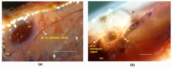 Longitudinal sections showing pollen tube growth in the pistil of the coconut variety WCT. (a) Pollen tubes growing inside the tubular canals three days after pollination and (b) pollen tubes accessing the micropylar region of ovule four days after pollination. Pollen tubes are marked by an arrow; pt, pollen tube; tc, tubular canal; ov, ovule; mc, micropyle. Sections of the pistil were stained with quadruple stains [] and visualized using a stereo microscope. Scale bar = 100 μm.