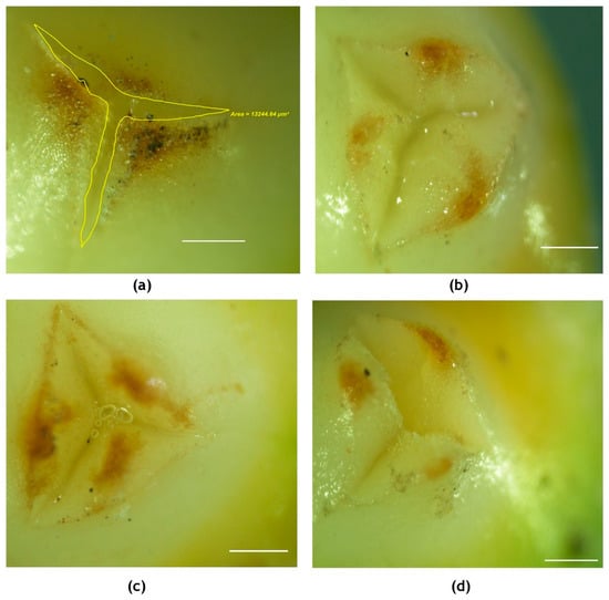 Visualization (2X) of receptive stigma of the coconut variety WCT under (a) ambient, (b) chamber control, (c) chamber with 3 °C rise in temperature and 55 + 5% RH and (d) chamber with 3 °C rise in temperature and 65 + 5% RH. The area in-between the opening of perianth lobes was measured as shown in (a) using a stereo microscope. Scale bar = 100 μm.