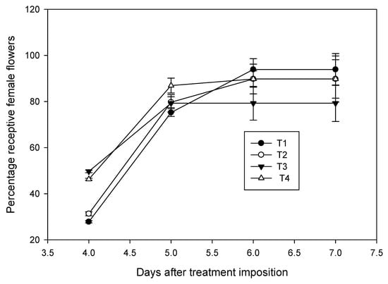 Effect of high temperature treatment on female flower receptivity of the field-grown coconut variety WCT. Receptivity of female flowers, which was denoted by splitting of white stigma and secretion of nectar, of ambient grown plants (T1) was compared with percentage decline in receptivity of flowers in chamber control (T2), chamber with 3 °C rise in temperature at 50 ± 5% RH (T3) and chamber with 3 °C rise in temperature at 65 ± 5% RH (T4). Bars on the lines indicate mean ± SD. Temperature treatment to the inflorescencewas imposed six days before the female flower receptivity.