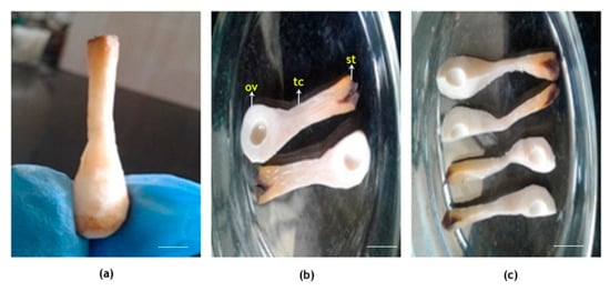 Dissection of coconut female flower. Outer calyx and exodermis completely peeled off, showing (a) intact longitudinal part; (b) two halves showing stigma, tubular canal and ovule-bearing region; and (c) small longitudinal sections. St, stigma; tc, tubular canal; ov, ovule. Scale bar = 5 mm.