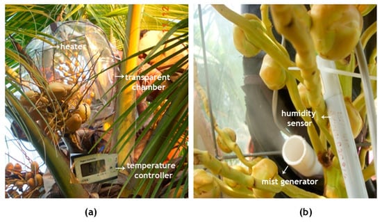In vivo experimental setup for the induction of high temperature treatment of the inflorescence of the coconut variety WCT. (a) The inflorescence was enclosed in a transparent chamber fitted with a microprocessor-controlled heater and (b) a mist generator for maintaining the temperature and humidity inside the chamber, respectively.