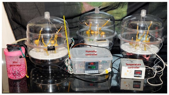 Considering the inherent hurdles of the in vivo experimental setup on tree tops and in maintaining multiple temperature profiles, an in vitro setup was developed to test the reproductive response of coconut to a wide range of temperatures (Figure 11). Fresh receptive female flowers were cut from the spadix along with a portion of the rachilla and immediately placed in a beaker containing a media of 10% sucrose, 0.01% boric acid and 1% agar. They were pollinated by WCT pollen and incubated in chambers with set temperatures of 29, 31, 33, 35, 37 and 40 °C with (55% and 65%) humidity control. The chambers used were transparent desiccators with a provision for a small outlet for air flow, fitted from the inside, and an Arduino-based humidity-cum-temperature sensor (DHT 22).The heating source and the mist generator to maintain humidity were as described in the in vivo experiments. The temperature and humidity treatment of the pollinated flowers was started as soon as they were placed in the chamber from 08:00 to 17:00 and continued for a period of 5 days. The incubated flowers were collected daily for four days for histological observations. Each treatment had at least three replications.