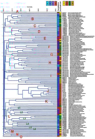 As a result of statistical analysis taking into consideration all the forests presented in the Supplementary Tables S1–S3, a dendrogram was generated (Figure 1). Here, we can distinguish 15 main groups: Groups A and O are greatly separated because they represent two very different forests from the Peruvian Amazonian lowlands: Group A containing Euterpe catinga Wallace (Pachiro brevipedis-Euterpetum catingae Galán de Mera 2001), and Group O containing Mauritia flexuosa L.f. (Oenocarpo maporae-Mauritietum flexuosae Galán de Mera 1996). Group B are the subhumid and humid meso-supratropical forests of Bolivia, and they are closely related to those of Argentina (C), because they contain common plants, such as Alnus acuminata, Baccharis latifolia (Ruiz & Pav.) Pers., Dolichandra unguis-cati (L.) L.G. Lohmann, Duranta serratifolia (Griseb.) Kuntze, Podocarpus parlatorei Pilg., Rubus bogotensis Kunth, and Rubus boliviensis Focke.