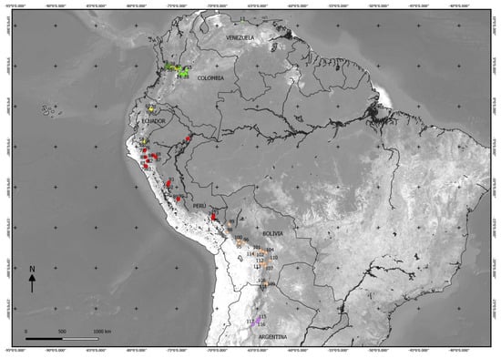 In the Peruvian Andes, some authors distinguish between mountain and brow forests [,,,]: the mountain extending between 1800 and 3400 m, where genera such as Cecropia, Cinchona, Luehea, and Ochroma are abundant, and are replaced by the mountain brow between 3400 and 3600 (3900) m above sea level, with Ericaceae, Polylepis, and Weinmannia. The most recent authors have established a more precise division [,,]: mountain rainforests, between 600 and 650 and 1300–1400 m, where trees reach 35 m in height, palms abound but not Mauritia, and wild cocoa appears; cloud forests, between 1300 and 1400 m and 2500–2550 m, trees up to 20 m with tree ferns, where the most common trees belong to the genera Brunellia, Ceroxylon, Hieronyma, Meliosma, Miconia, Myrcianthes, Saurauia, and Sapium, and Alnus acuminata Kunth especially dominates along watercourses, and dwarf forests (mountain brow), between 2500 and 2550 and 3000–3800 m, up to 5–20 m of tree canopy, where Axinaea, Cervantesia, Columellia, Drimys, Escallonia, Gaiadendron, Hedyosmum, Ilex, Miconia, Myrsine, Styrax, Symplocos, and Vallea are the most common genera. Understories consist of scandent bamboos, mainly of the genus Chusquea, with vines of Clematis, Mutisia, Jungia, and Passiflora. The higher zones have forests of Buddleja, Gynoxys, and Polylepis. In general, mountain forests reach 4700 m in Bolivia, and 3800–4200 m from southern Peru to Venezuela. This division is very close to that of Malizia et al. [] in Argentina, which distinguishes four vegetation belts: tropical premontane forest plots (<1500 m above sea level) associated with Clarisia biflora Ruiz & Pav., Heliocarpus americanus L., and Solanum ochrophyllum Van Heurck & Müll. Arg., while Nectandra subbullata Rohwer and Piper obliquum Ruiz & Pav. are related to tropical lower montane forest plots (i.e., 1500 to 2700 m above sea level). Cornus peruviana J.F.Macbr., Hedyosmum scabrum (Ruiz & Pav.) Solms, Hesperomeles ferruginea Lindl., Licaria applanata van der Werff, Myrcianthes rhopaloides (Kunth) McVaugh, Myrsine dependens (Ruiz & Pav.) Spreng., and Podocarpus oleifolius D.Don are associated with tropical upper forest plots (i.e., 2700 to 3500 m above sea level), while Polylepis pauta is grouped with plots above the upper forest line (>3500 m above sea level).