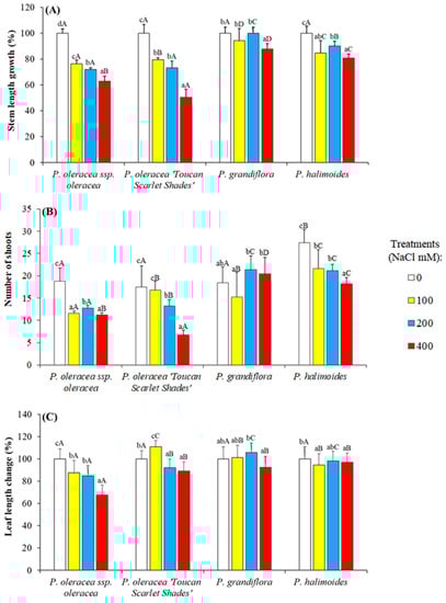Stem lengths at time of harvest (5 weeks) for controls ranged from 17.37 cm to 31.00 cm in P. halimoides and P. oleracea L. subsp. oleracea, respectively. Applied soil salinity had a detrimental impact on the main stem growth of all four investigated genotypes, inducing a decrement in lengthening in parallel to increasing applied salt concentration. This varied between the different taxa, being very acute in the two studied P. oleracea genotypes, where stem length growth was reduced by nearly 40% and 50% in P. oleracea L. spp. oleracea and P. oleracea “Toucan Scarlet Shades”, respectively (Figure 1A). On the other hand, P. grandiflora, and P. halimoides seemed to be less affected with all applied salt concentrations, reporting a mere decrease in stem growth of 12.24% and 19.23%, respectively, in 400 mM NaCl treated plants.